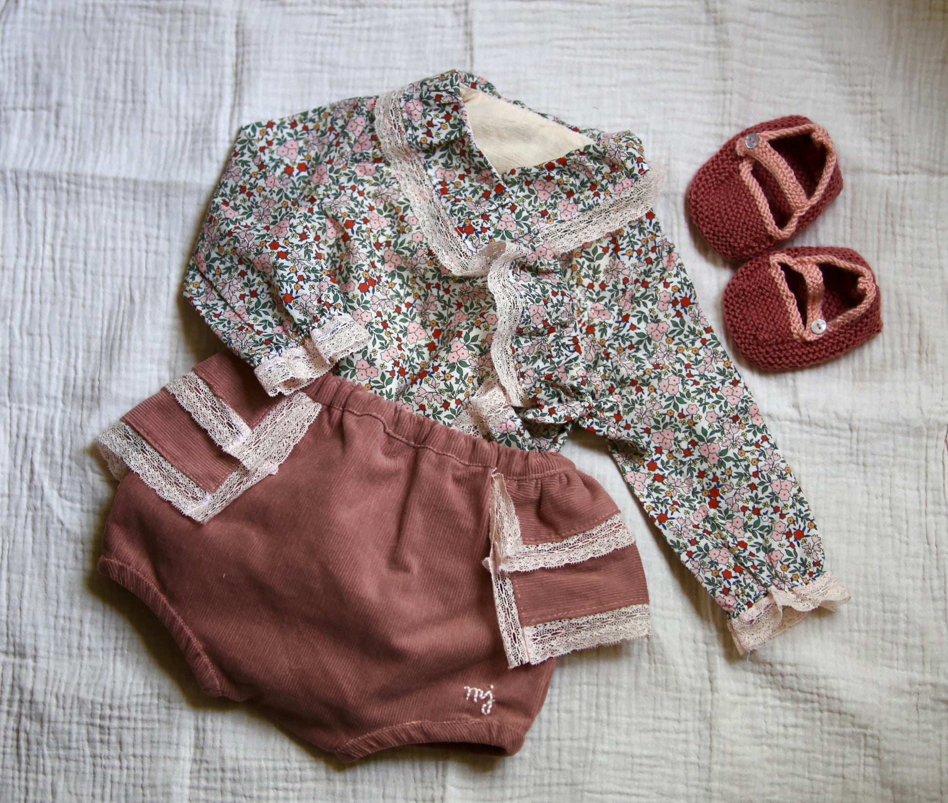 Le Bloomer Célèstine allie la douceur du velours côtelé à des fronces délicates et des finitions en dentelle raffinée. Sa taille élastiquée offre un confort optimal tout en apportant une touche sophistiquée idéale pour sublimer les tenues de votre bébé avec élégance.