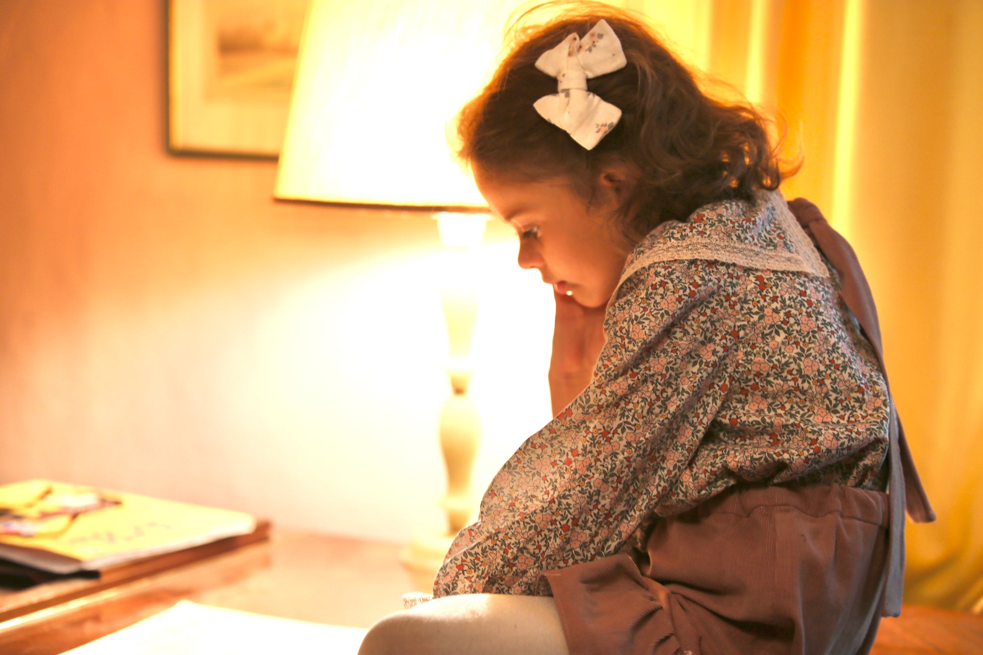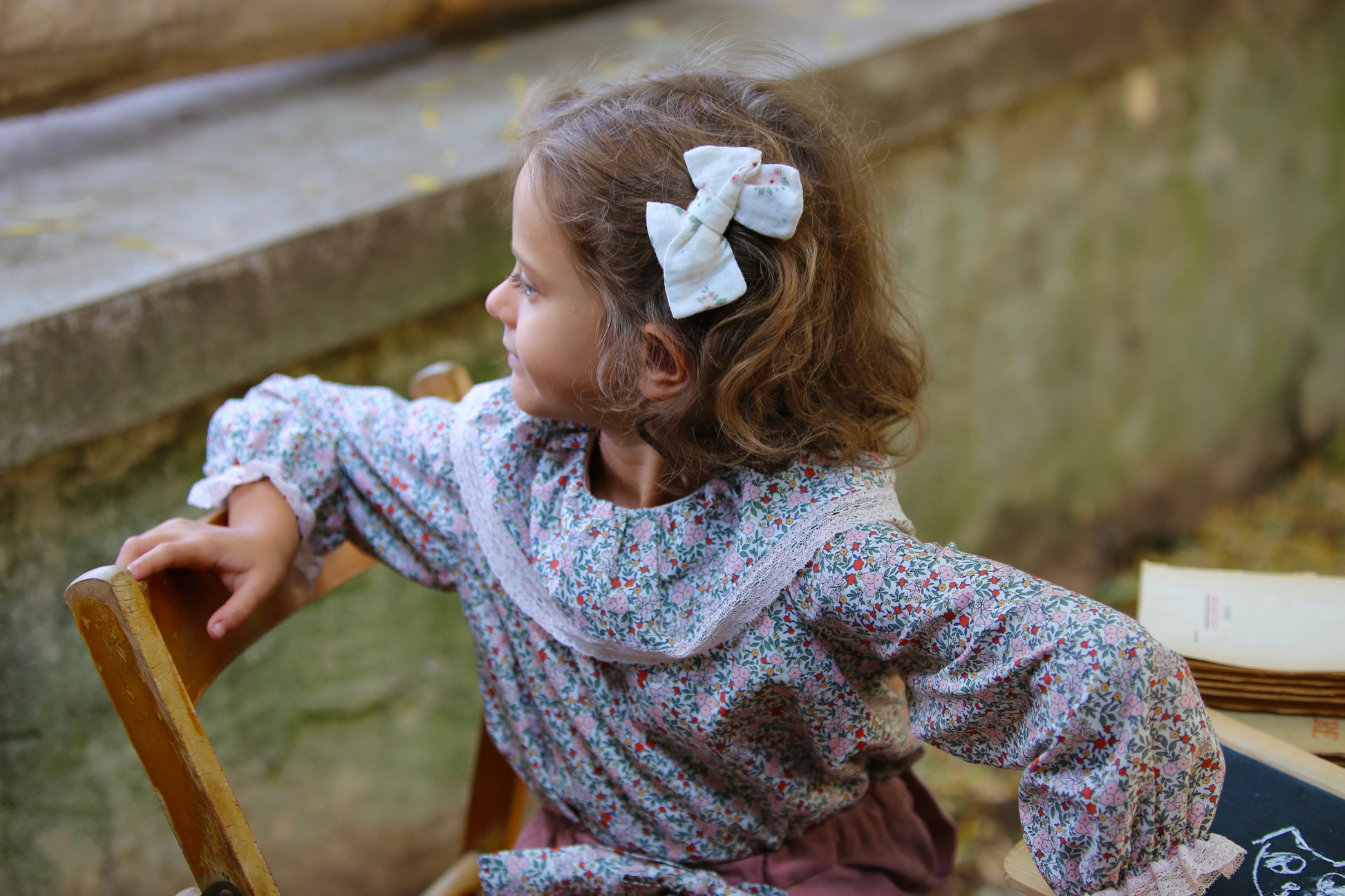 La blouse Chloé en coton fleuri, douce et doublée, offre confort et élégance. Ses manches longues avec poignets élastiqués et dentelle, ainsi que le col froncé délicatement orné, ajoutent une touche raffinée. La fermeture dos avec noeud en velours complète ce modèle sophistiqué.